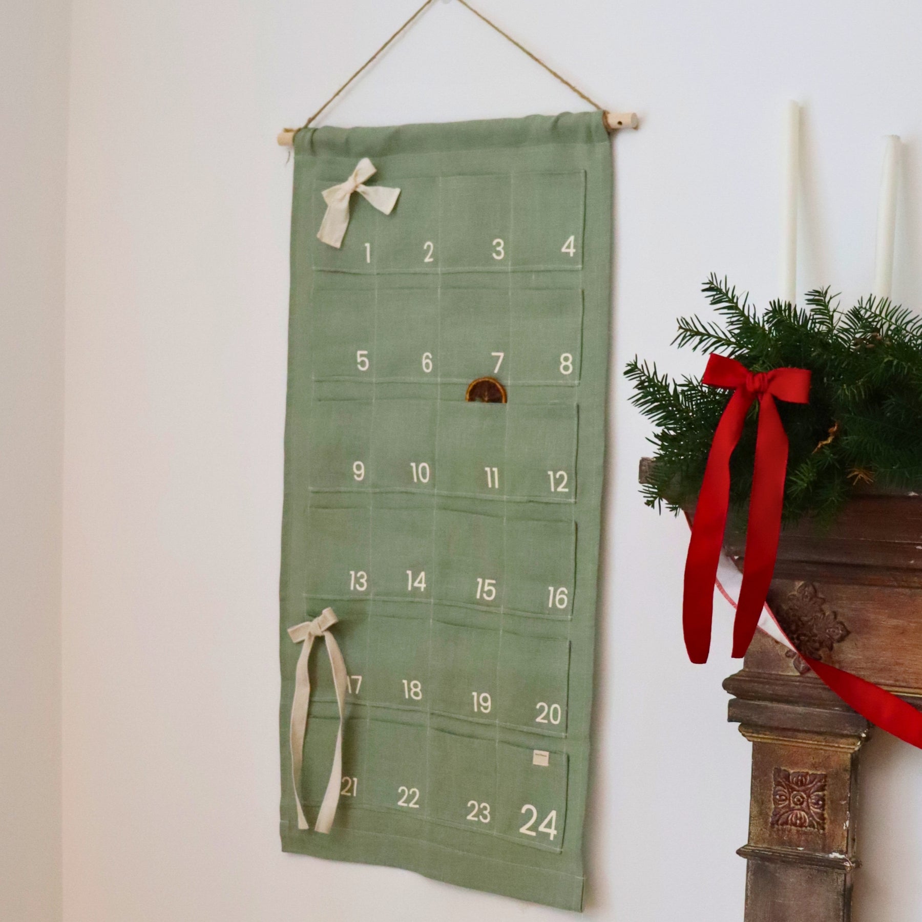 Emballage cadeau réutilisable Vice-Versaᴷᴵᵀ - Bandeau velours côtelé vert forêt sur un Furoshiki blanc et un chou tartan rouge et vert