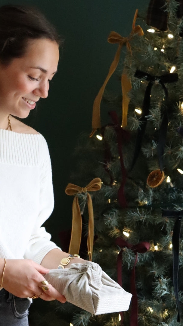 Nos emballages en tissu sont une alternative durable aux emballages traditionnels en papier. Ils sont réutilisables, réduisent les déchets et ajoutent une touche élégante à vos cadeaux. Le furoshiki, inspiré da la méthode de pliage japonaise peut être offert seul ou rehaussé d'un chou à cadeau, d'une boucle ou de garnitures naturelles (oranges séchées, sapinage).